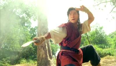 Of all the main actors and actresses, none of them that I am aware of are properly trained martial artists, but they are made to be very believable in The Moon Warriors, Andy Lau in particular. In several scenes, if you look reasonably closely, it is quite apparent that Maggie Cheung and Anita Mui are doubled for some of their fight sections, but this doubling has been done very well, so it does not distract from the entertainment. Andy Lau, though, really impressed me. Granted he has done quite a number of films where he has had to do some weapons work, and I'm guessing he has done some martial arts training in his acting career (he can do the splits!), but he still pulls of some very cool looking moves in The Moon Warriors. He handles his sword well, and in the scenes where his village is being attacked, he is agile and co-ordinated enough to perform lots of jumps and kicks and the like on the bad guys.